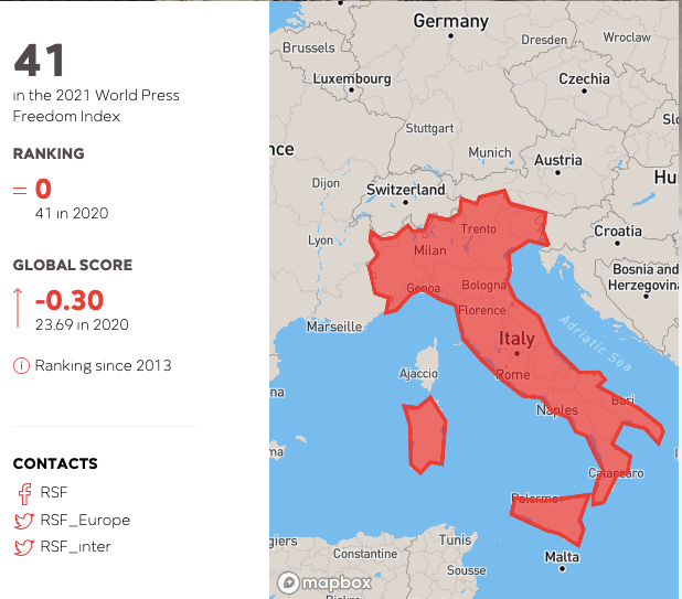 Sempre secondo il World Press Forum Index, stilato da Reporter Senza Frontiere, l’Italia si colloca al 41esimo posto, come nel 2020. Qui potete trovare l’intero indice. La valutazione del Belpaese è stata condizionata anche dal verificarsi di diversi movimenti di protesta, che durante la pandemia hanno acquisito nuova forza.
